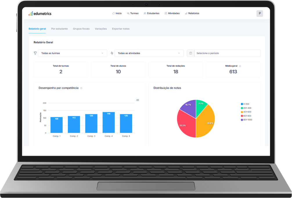 A Edumetrics não é apenas uma plataforma; é um ecossistema de gestão e inteligência pedagógica que transforma a maneira como escolas e redes de ensino trabalham com redação. Entre em contato e leve o futuro da avaliação para a sua instituição.
